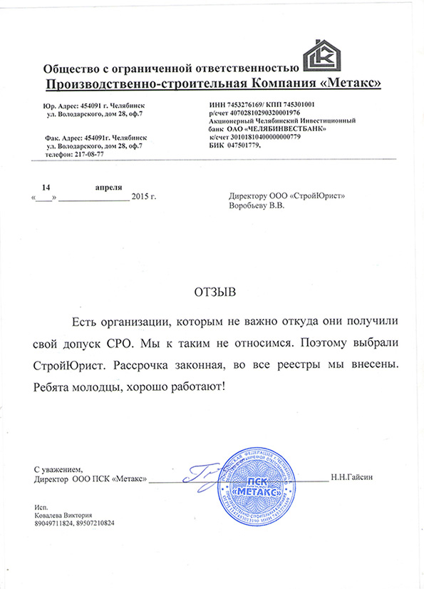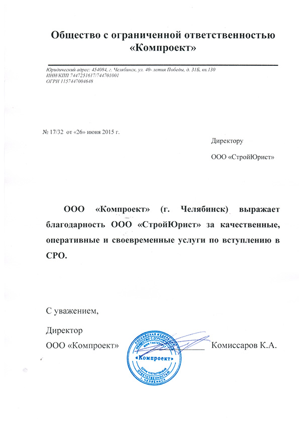Отзывы клиентов "СтройЮрист" по вступлению в СРО в Щелково